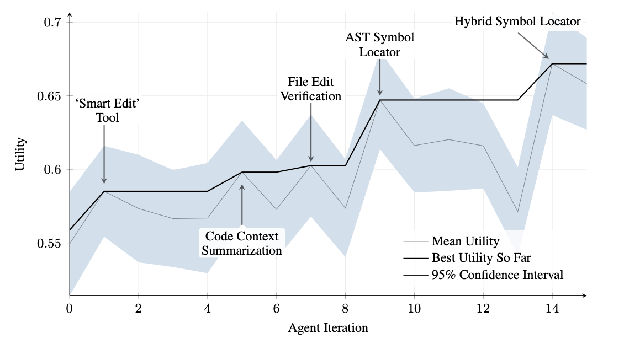 图 2:跨迭代的性能表现。关键改进用其相应的工具或 Agent 修改进行标注。(由 Maxime Robeyns、Martin Szummer、Laurence Aitchison 提供)